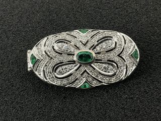 Broche de oro blanco de 18 kilates con esmeraldas y diamantes ♦️.