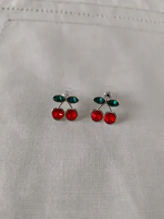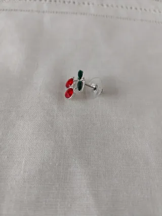 Pendientes con un divertido diseño de cerezas, de la firma Pacha - Detalle de hojas verdes. - Cuerpo de la cereza en rojo brillante.