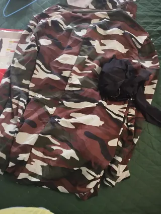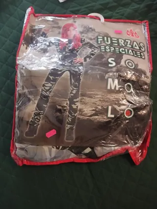 Disfraz de fuerzas especiales con estampado de camuflaje. - Diseño de dos piezas. - Estampado de camuflaje en tonos verdes y negros. Más disfraz de astronauta, con accesorios, nunca usado.
