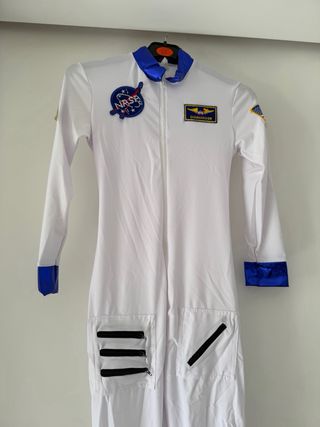 Disfraz de astronauta con detalles inspirados en la NASA, talla S de mujer, vale para niña de 14/16 años tambien. Está como nuevo, fue solo puesto para una sesión de fotos, pero tiene dos marcas por debajo dela altura de la rodilla ( ver foto). Incluye mono, tirantes y bolsa de transporte. Es muy bonito #Carnaval - Diseño de mono completo. - Cuello y puños en azul. - Parches temáticos. - Cremalleras negras en las piernas. - Incluye tirantes negros. HAGO ENVIOS