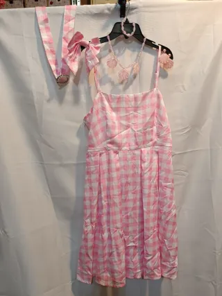 Conjunto de disfraz inspirado en Barbie, con un diseño a cuadros. - Vestido con tirantes. - Cinturón con hebilla decorativa. - Incluye lazo a juego. - Collar con colgantes de conchas. - Pulsera a juego. - Pendientes de concha. - Talla equivale a M, nuevo, sin embalaje original