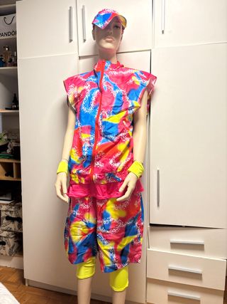 Conjunto de disfraz inspirado en la película Barbie y Ken para adultos. Incluye varias piezas con un diseño vibrante y colorido. El precio es por el pack de los dos. - Chaqueta con cremallera. - Body. - Pantalón corto. - Brazaletes. - Diseño abstracto multicolor.