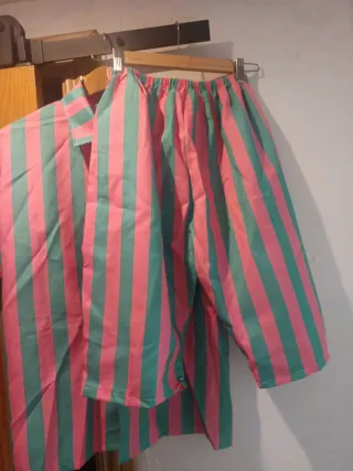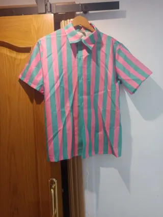 Disfraz inspirado en Ken de la película Barbie. Talla M/L. - Diseño de rayas verticales. - Manga corta. -Pantalón con goma -Color rosa y verde -Regalo peluca rubia