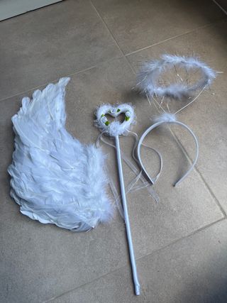 Precioso disfraz de alas de ángel, perfecto para carnaval o cualquier fiesta de disfraces. Incluye: - Un par de alas blancas de plumas. - Una diadema con aro de halo. - Una máscara para los ojos.