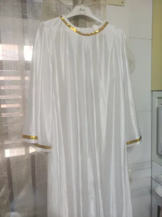 Túnica unisex para disfraz de angel en navidad, o virgen María. Tiene estropeada la cremallera trasera. Largo 105cm, tiene para bajar hasta 110 cm . Y chaleco de pastor de niño.