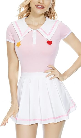 Conjunto de disfraz de animadora o colegiala. - Diseño de cuello marinero blanco con detalles rosas. - Adornos de estrella amarilla y corazón rojo. - Falda plisada blanca con ribete rosa.