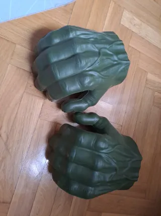 Set de juego de Hulk compuesto por 2 puños electrónicos que hacen sonidos al golpear y una máscara. Talla infantil. Funcionan correctamente (sonidos activos, solo hay que poner pilas si hace falta). Usados pero en buen estado, sin roturas importantes; la espuma/plástico mantiene bien la forma. Ideales para disfraz, carnaval o juego en casa. No incluye caja.