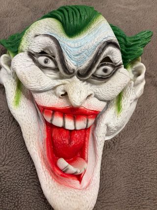 - Máscara de Joker para adulto, ideal como accesorio para disfraces de este personaje tan peculiar. - Presenta un diseño detallado, con cabello verde y oscuro y pintura facial característica. - Es nueva, nunca se ha usado, pero tiene una pequeña raja en la parte derecha, que se disimula muy bien con el pelo.