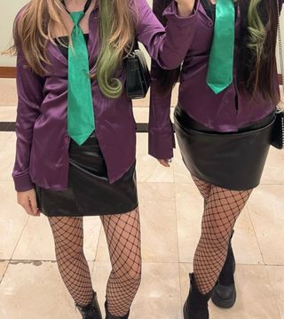 Conjunto de disfraz inspirado en el Joker, talla XXS/XS. - Camisa de satén morado. - Corbata verde brillante. -Falda tipo piel+tatoos+cadenas