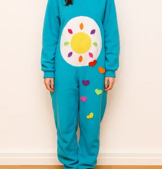 Este mono azul es un disfraz divertido con un diseño inspirado en los Osos Amorosos. Presenta un gran sol blanco con detalles de colores en el pecho y varios corazones de fieltro de diferentes tonalidades repartidos por la prenda. Tengo disfraz de oso morado más grande - Diseño de sol en el pecho. - Corazones de fieltro de colores. - Mono completo.
