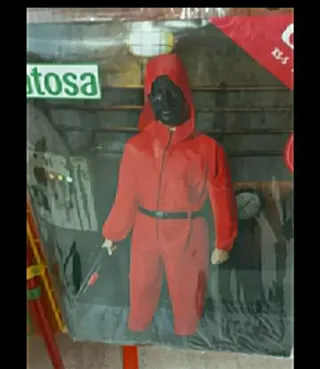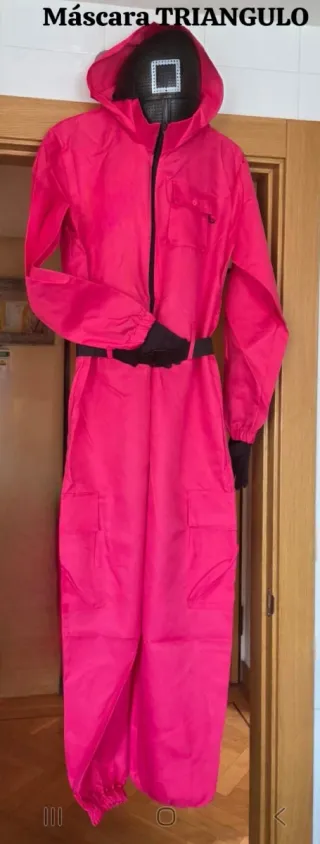 Disfraz inspirado en la popular serie El Juego del Calamar. Incluye máscara y accesorios. - Talla M. - Diseño icónico de la serie. - Guantes - Cinturón - Mascara Triangulo - Mono