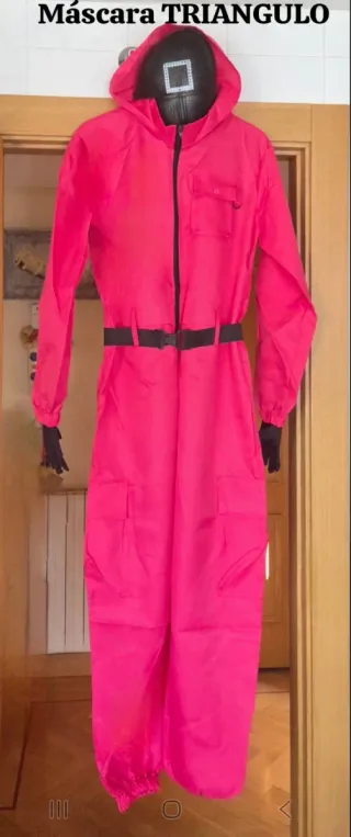 Divertido e infame DISFRAZ de GUARDIA del Juego del Calamar con SÍMBOLO TRIÁNGULO en talla L. NUEVO SIN ESTRENAR CON ETIQUETAS. Este disfraz modernizado estándar incluye un mono fucsia con capucha, puños de mangas y de pantalón con elásticos, gran cremallera frontal negra. Medidas: - Largo: 160 cm - Sisas : 118 cm - Cintura: 110 cm - Cadera: 116 cm ** Disfraz Incluye: Mono con capucha, cinturón negro elástico con hebilla de clip de plástico, guantes negros elásticos y máscara de plástico con goma símbolo TRIÁNGULO. ** ÚLTIMA UNIDAD