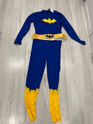 Disfraz completo de Batwoman con detalles icónicos. Mono de color azul con detalles amarillos. Cinturon de Batwoman. Capa negra com interior amarilla. Mascara negra. - Diseño de cuerpo entero. - Cinturón amarillo con logo. - Mangas largas. - Parte inferior de las piernas en amarillo.