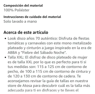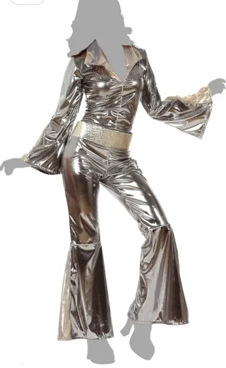 Este disfraz retro para mujer es perfecto para fiestas temáticas o eventos especiales. - Diseño de mono completo. - Detalles brillantes. - Cinturón plateado con hebilla. - Pantalones acampanados.
