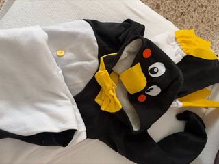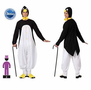 Disfraz de pingüino completo, ideal para fiestas o eventos. - Incluye capucha con detalles de pingüino. - Mono blanco y negro . - Pajarita amarilla. - Pies amarillos. .