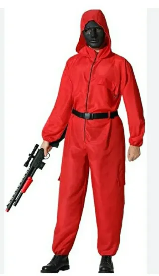 Disfraz inspirado en la popular serie El Juego del Calamar. - Mono completo de color rojo. - Máscara con diseño característico. - Cierre de cremallera frontal.