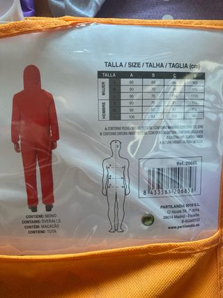 Incluye máscara. Quedan 9 conjuntos. Tallas: · S (T-42): 6 unidades. · ML (T-52): 3 unidades. La S es muy larga de piernas para una persona de 1,60 y hay que acortarla. La L es para 1,80.