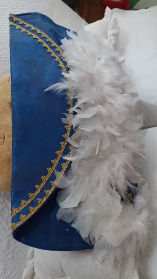 Conjunto de disfraz de pirata corsario con detalles dorados y adornos de plumas. - Chaqueta azul con bordes dorados. - Camisa blanca con volantes. - Sombrero de pirata con plumas blancas. Precioso disfraz, de buena calidad. Tela muy agradable y abrigada. Muy buen acabados. Detalles de puntilla y adornos dorados. Uns de las botas tiene un pequeño roto. NO ES TELA DE DISFRAZ