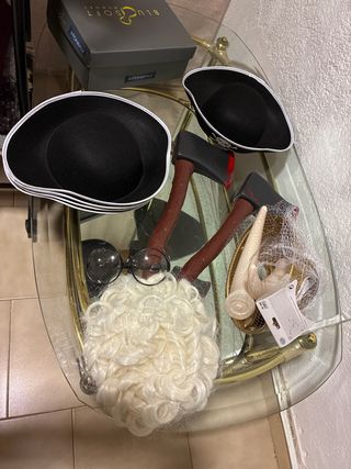Vendo traje completo: * falda de raso, interior de tela y tul de muy buena calidad. 52 cm de largo delante y 125 cm de largo detrás. Cintura 31 cm de largo (ver fotos): 25 euros * cinturón de piel de pirata, hecho a medida (38 cms de ancho): 15 euros * botas de piel de pirata, talla 37, marca Wonder: 25 euros * guantes de plumas (pareja), solo se usó uno: 3 euros * collar y pendientes, hechos a medida: 25 euros * coleta de pelo moreno, 75 cm: 4 euros * 3 bodies con corchetes para sujetar la tira de tul, tela de raso a juego con la falta y mano: 7 euros. Puesto solamente 4 días en fiestas. Las botas son lo único que tiene más uso.
