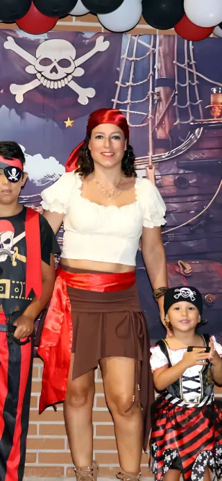 Disfraces de pirata para familia compuesto de: Hombre talla L Mujer talla S Niño talla hasta 12 meses. Además incluyó las espadas. Si se compra en mano. No las envío porque son larguitas - Camisa blanca con cordones. - Pantalones a rayas azules y negras. - Cinturón con calavera. - Parche para el ojo. - Pañuelo de cabeza a rayas.
