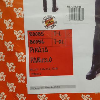 En excelente estado. Talla M. Talla correctamente. Incluye cubre botas (sin usar), pantalón pirata, camisa, chaleco, cinturón y pañuelo rojo