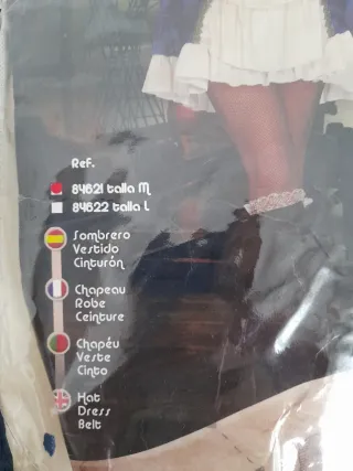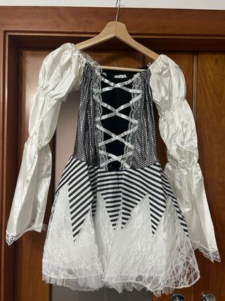 Disfraz de mosquetera o pirata sin estrenar, talla M. Incluye vestido,sombrero y detalle Rosa para las botas El vestido blanco interior mide del hombro al bajo 63 cm