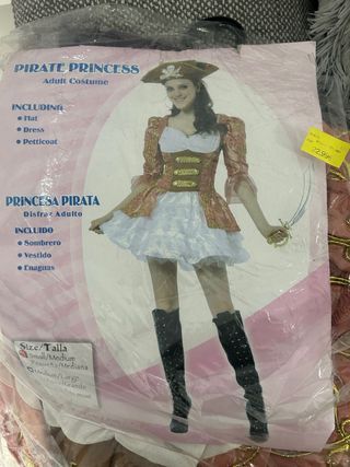 Este disfraz pirata tiene un diseño llamativo y detallado. - Incluye el sombrero - Mangas largas de tul. - Falda con volantes de encaje. - Estampado damasco. Posibilidad de comprar más accesorios. - Cinturón 3€ - 1 Par de dependientes aro 1€ - Espada 2€ - Espada con punta rota 1€ - Pañuelo, parche y pendiente sin agujero 1,50€ (sin estrenar)