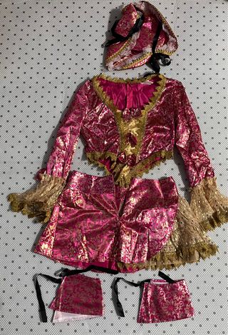Este disfraz de pirata está confeccionado en terciopelo con detalles bordados (hecho a mano). Se compone de: - camisa blanca con flores en el cuello de lentejuelas rojas - falda rojo- burdeos - tela q se une a la falda y cubre parte del cuerpo- chaqueta de un hombro - pañuelo de la cabeza - manga con bordado brocado brillante - Tejido principal de terciopelo. - Adornos dorados y rojos. - Diseño con bordados intrincados. Presenta algunas manchas amarillentas en la camisa de estar guardado
