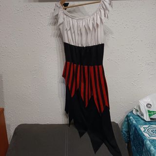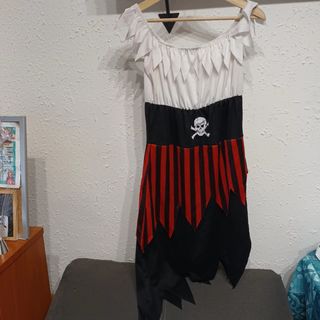 Este disfraz de pirata de mujer sexy incluye vestido, dos mangas, sombrero, cinturón y bolsa.El vestido es corto y ajustado en el pecho con escote,hay una lazada dorada satinada para simular un corsé.En los lados hay dos bandas de tejido negro efecto terciopelo .El terciopelo tiene detalles barrocos brillantes y dorados. Las mangas bombachas rojas satinadas decoran los brazos. tienen gomas para que haya una buena sujeción.El sombrero es un tricornio de tejido satinado negro y contorno rojo y dorado.El contorno de la cabeza es de 59 cm. Esta absolutamente nuevo porque el año pasado lo compré y no pude usarlo.Me costo en Vegaoo.es 62€