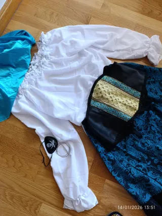 Conjunto de disfraz de pirata para mujer. Incluye varias piezas para un look completo. - Blusa blanca con escote elástico. - Corsé negro con detalles dorados y azules. - Falda larga azul con estampado. - Puños negros con estampado y borde dorado. Puesto una vez. Regalo pendientes y parche
