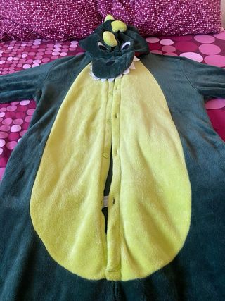 Disfraz de pijama con diseño de dinosaurio. - Cierre frontal con botones. - Capucha con detalles de dinosaurio. - Mangas largas y pantalón. - Material suave y cómodo.