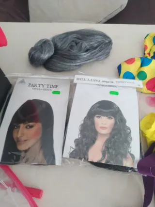 Lote de tres pelucas para disfraces o carnaval. Son de talla única con flequillo 2 rizadas y 1 lisa y 1 vestido transparente oara Disfraz PRECIO POR TODO Junto