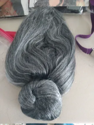 Lote de tres pelucas para disfraces. - Peluca gris de abuela usada - Peluca negra sin estrenar - Peluca negra rizada sin estrenar