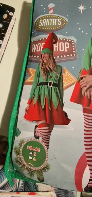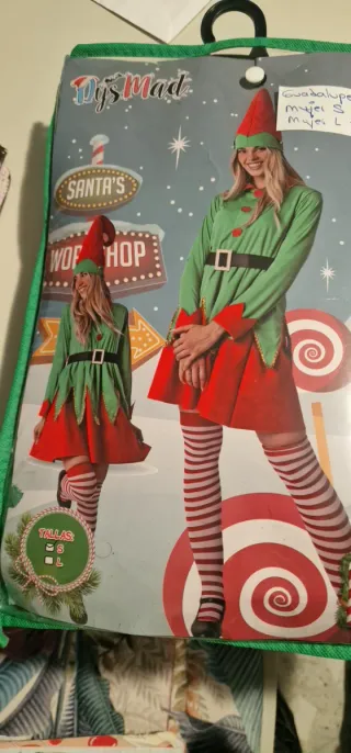 Conjunto de dos disfraces de elfo, uno en talla S y otro en talla L. - Disfraz de elfo para adulto. - Incluye gorro, vestido y cinturón. - Diseño festivo con detalles rojos y verdes.