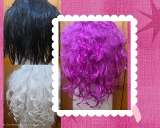 Conjunto de pelucas de fantasía para disfraces. - Peluca rizada morada. - Peluca rubia con lazo azul. - Peluca negra y blanca. - Peluca negra larga. - Peluca rizada rosa. - Peluca negra corta.