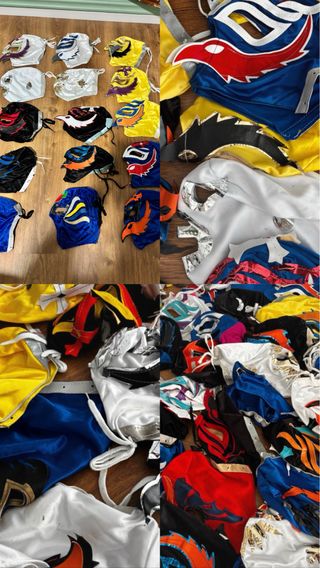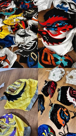 Gran lote de mascaras de lucha libre mexicana. Pack de 20 máscaras de lucha libre mexicana, ideales para coleccionistas o eventos. - Diseños variados y coloridos. - 100% poliéster. - No aptas para menores de 3 años. - Talla única para adultos. - Pack de colores surtidos. - Precio unidad suelta: 2€ - Pueden tener desperfectos estéticos o falta de algún accesorio (cinta para atarlo). - Ideales para disfraz, halloween, carnaval, customizar, diy, dragqueen, modistas, patronaje, diseñadores o estudiantes de corte y confección.