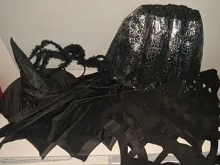 Disfraz de Halloween con temática de araña y telaraña. - Tutu diseño en color negro y plateado. - Detalle de telarañas plateadas sobre fondo negro. - Capa con lazo de telaraña. - Incluye un accesorio de araña grande en diadema. - Incluye sombrero de bruja. - Incluye dos capas negras de disfraces de murcielago - Estilo de talla única. Además Incluye un lote surtido de decoración.