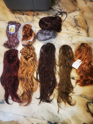 Lote de 9 pelucas de pelo largo y liso, ideales para disfraces o eventos. - Variedad de tonos marrones y rojizos. - Talla única, se adaptan a la mayoría. - Perfectas para complementar tu atuendo.