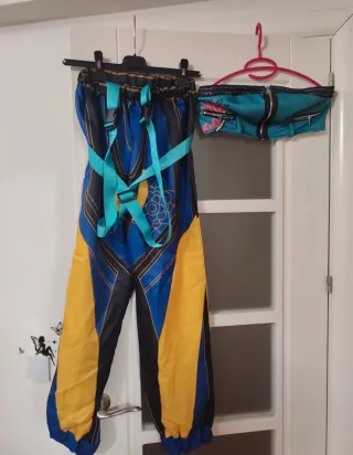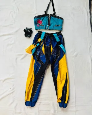 Conjunto de disfraz inspirado en Zoey, estilo K-pop. - Top corto con detalles metálicos y estampado de flor de loto. - Pantalones holgados con diseño geométrico y detalles dorados. - Incluye accesorio de cintura con borla amarilla. - Talla M/L.