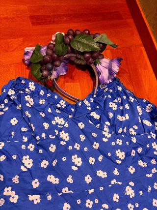 Disfraz Carnaval de mujer estilo hippie elegante y colorido, talla M-L, marca Kimokawaii. NUEVO, sin estrenar, procedente del cierre de la tienda Tejidos Riaza, taller artesano español especializado en vestuario para teatro, colegios, baile y Carnaval. Conjunto en tonos morados y florales, mangas amplias translúcidas y pantalón acampanado que estiliza la figura y atrae todas las miradas. Ideal para Carnaval, fiestas temáticas y eventos retro. Incluye: blusa, pantalón y cinta para la cabeza. Cómodo, vistoso y con acabados muy superiores a disfraces de producción masiva, una elección segura que transmite alegría y personalidad.