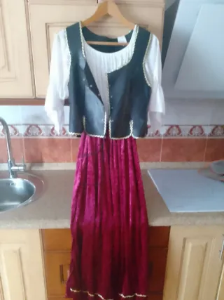 Disfraz de carnaval con un diseño llamativo. - Tejido de terciopelo. - Detalle de cordones dorados en el escote. - Cinturón a juego. Como se ve en las fotos, en una manga tienes unas manchitas y los cordones dorados están deteriorados por el tiempo. Aún así es un vestido muy bonito para echar un rato en Carnavales o una fiesta de disfraces. Sólo hago envíos por INPOST. Gracias 😊
