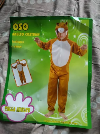 Disfraz de oso marrón con capucha, ideal para fiestas o carnaval. Es suave y cómodo. - Diseño de oso. - Color marrón y blanco. - Cierre de cremallera frontal.