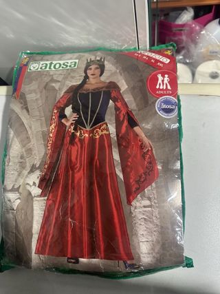 Disfraz de reina medieval, ideal para carnavales o fiestas temáticas. Este traje combina un vibrante color rojo en el cuerpo y la falda principal, con detalles en azul y toques dorados. Nuevos a estrenar varias unidades misma talla - Diseño inspirado en la época medieval. - Mangas abullonadas con detalles. - Falda larga con paneles de color.