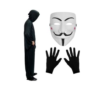 Disfraz de Guy Fawkes Anonymous Máscara, Túnica con capucha negra y guantes negros. Es la representación del conspirador católico inglés del mismo nombre, miembro de la conspiración de la pólvora, quien intentó volar la Cámara de los Lores en Londres en 1605, conocido como Guy Fawkes. Ideal para Halloween, Carnaval, Fiesta Tematica, Desfile, Etc. Máscara totalmente nueva empacada a estrenar. Disponible en diferentes tallas para adulto: - S / M / L / XL España (48/72 horas hábiles), Italia (4 días laborables) y Portugal (3 días)