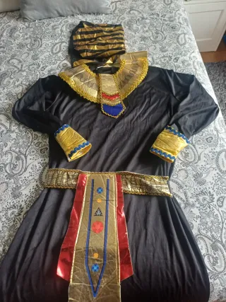Disfraz de faraón o rey egipcio, ideal para fiestas temáticas o Carnaval. El traje incluye varios elementos decorativos dorados y coloridos. - Diseño inspirado en la vestimenta del antiguo Egipto. - Adornos dorados con detalles en rojo y azul. - Incluye tocado a juego.