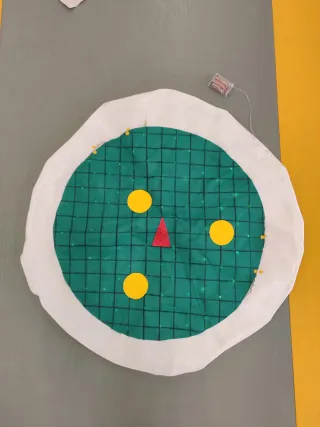 Disfraz divertido con estampado de pizza para adultos. - Diseño redondo con abertura para la cabeza. - Estampado realista de pepperoni y queso.