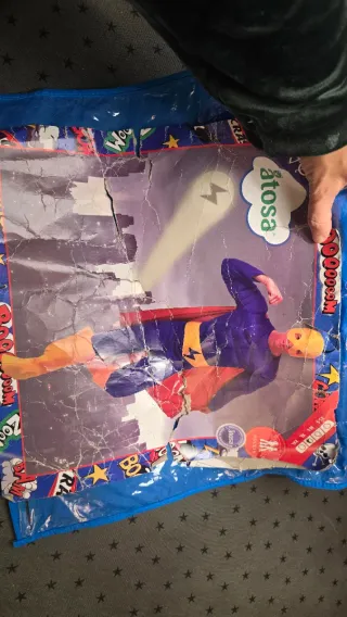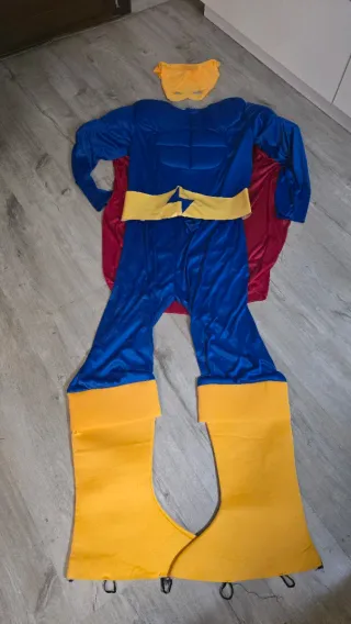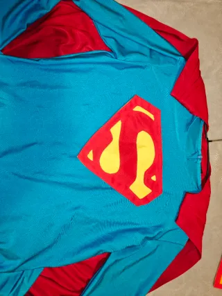 Disfraz del personaje Superman. - Diseño clásico azul y rojo. - Mono lycra gruesa azul marino, talla XXL para alguien de entre 1,70- 1,90. Buen material, no AliExpress o funidelia que se rompen a la primera - Escudo de Superman en el pecho tela elastica para pegar o coser - capa Roja