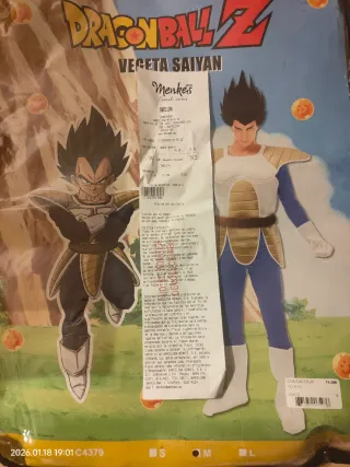 Disfraz de Vegeta de Dragonball Z, ideal para carnaval o Halloween. Vendo disfraz de Vegeta (Dragon Ball Z) por error de talla. El disfraz está impecable, usado solo una vez durante unas pocas horas. Es un traje de buena calidad, muy completo. Lo vendo porque me queda grande (es una talla M completa). Estado: Como nuevo. Talla: M. Precio original: 74,35€ (tengo el ticket de compra para demostrarlo). Hago envíos mediante Wallapop o entrega en mano. ¡Escríbeme si necesitas fotos reales o medidas específicas!