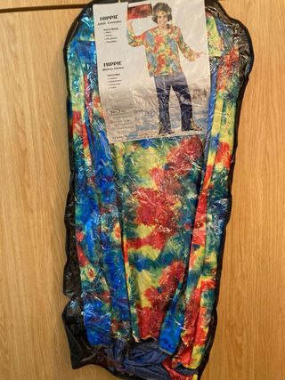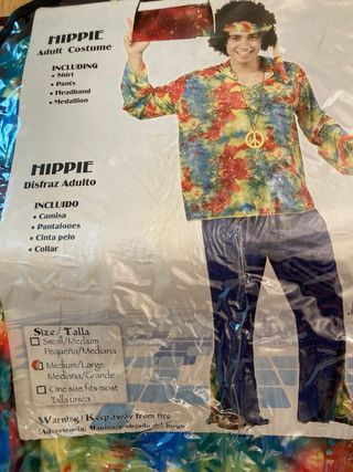 Disfraz de estilo hippie para adulto. Incluye camisa, pantalón y diadema. - Camisa con estampado psicodélico. - Pantalones a juego. - Diadema con accesorio. - Incluye un collar.