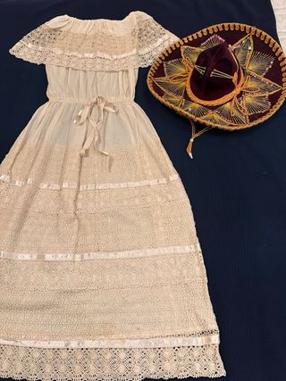 Conjunto de disfraz tradicional. - Vestido largo de encaje beige. - Chaleco o fajín de rayas multicolores. - Sombrero charro con adornos.